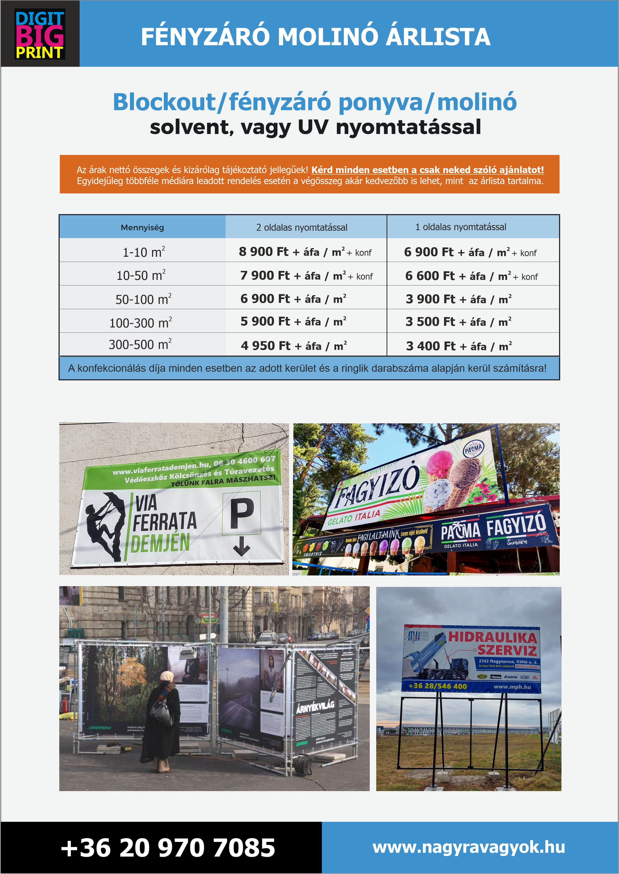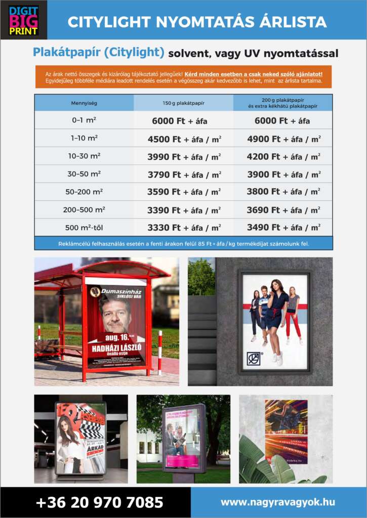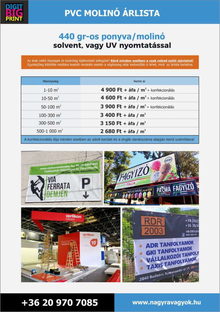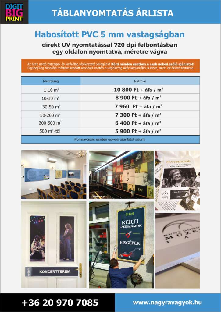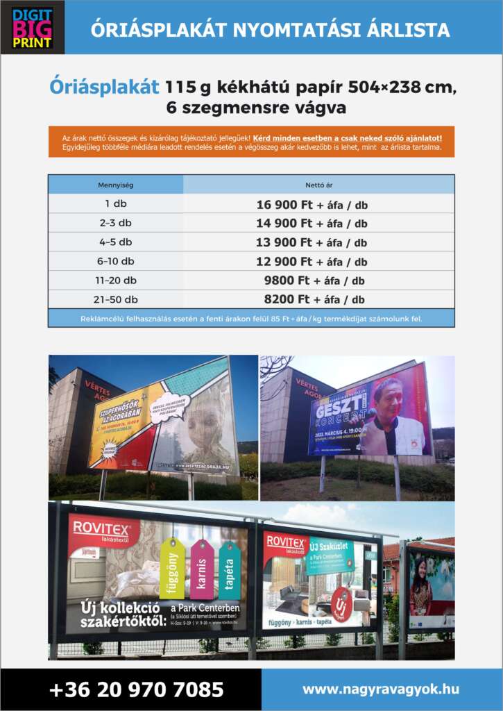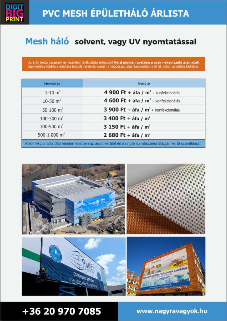 Az utóbbi idők drasztikus alapanyag áremelései végett az alább közölt nyomtatási összegek AJÁNLATNAK NEM MINŐSÜLNEK, kizárólag tájékoztató jellegűek, ezért mindenképp kérd egyedi, csak neked szóló ajánlatunkat! Az adott médiához tartozó árak forint/m2-ben értendőek, és nettó költségek.