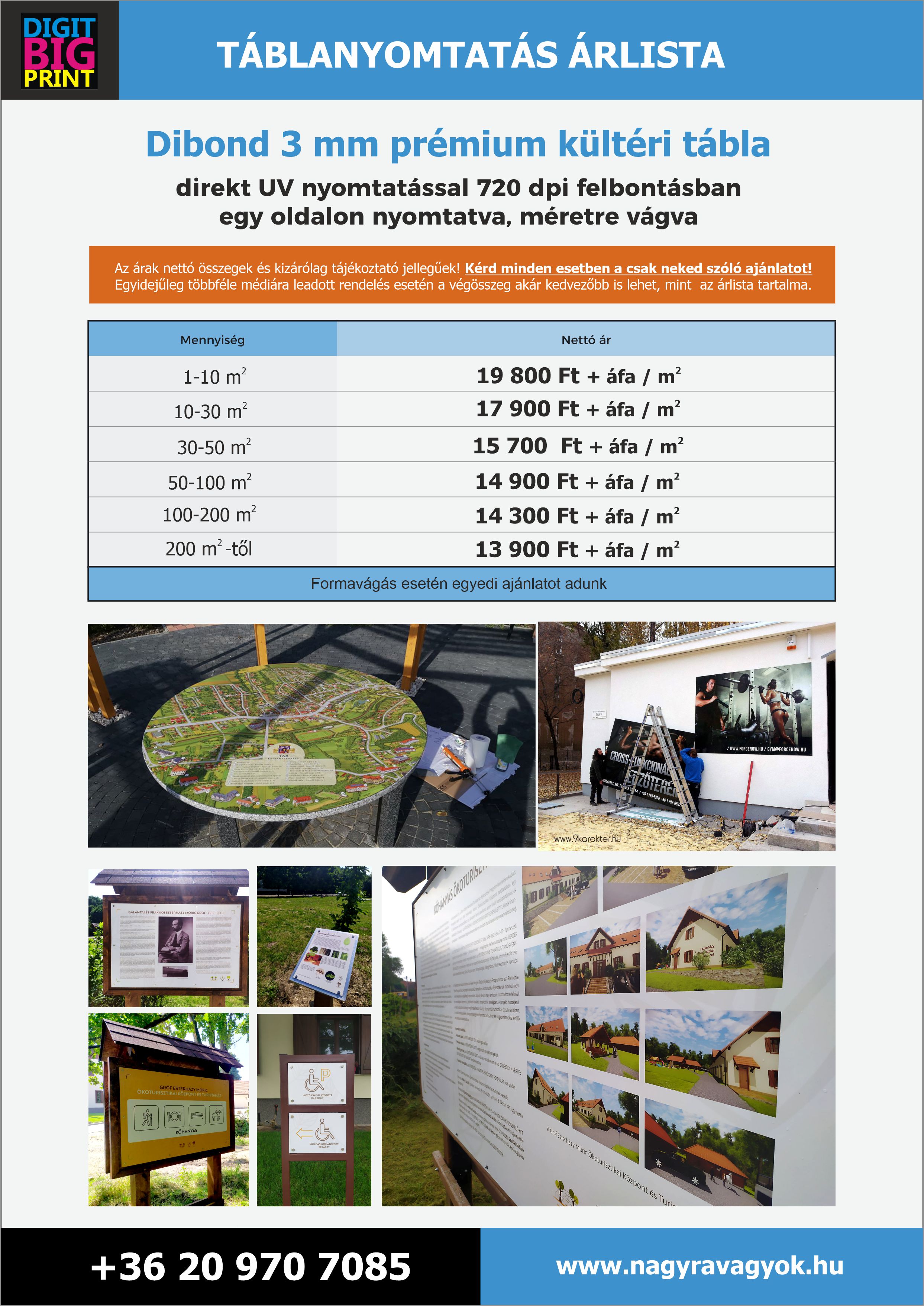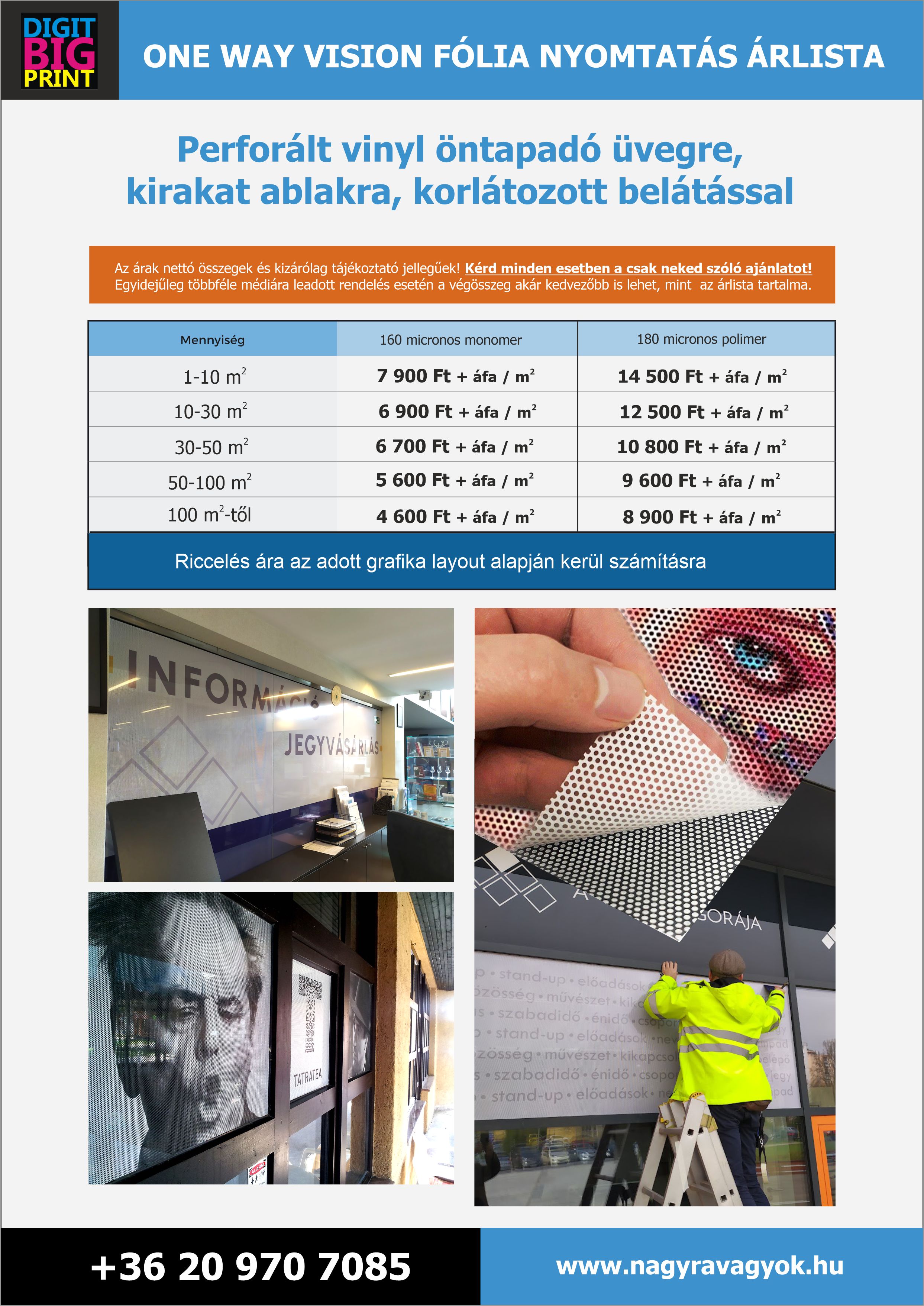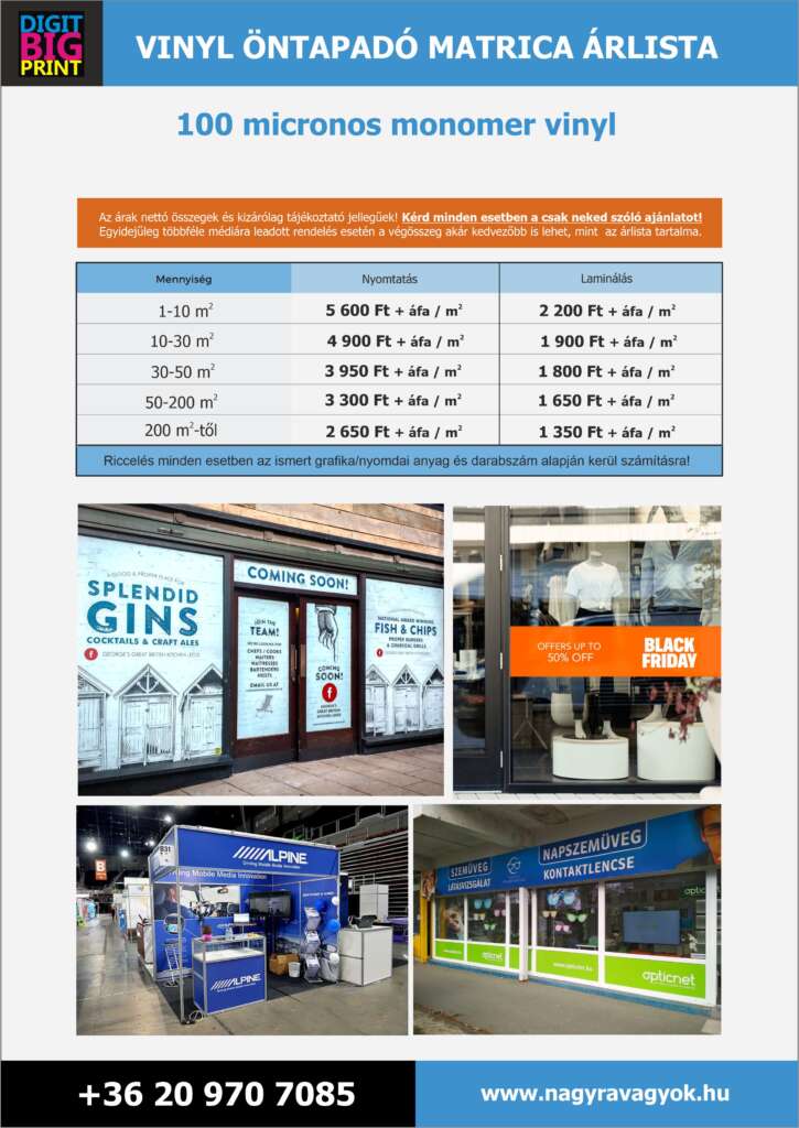 Az árak az esetleges felhelyezési költségeket nem tartalmazzák. A nyomtatott nagyméretű anyagokat kérésedre felhelyezzük, a felhelyezés összegét kizárólag helyszíni szemrevételezés után tudjuk kalkulálni.